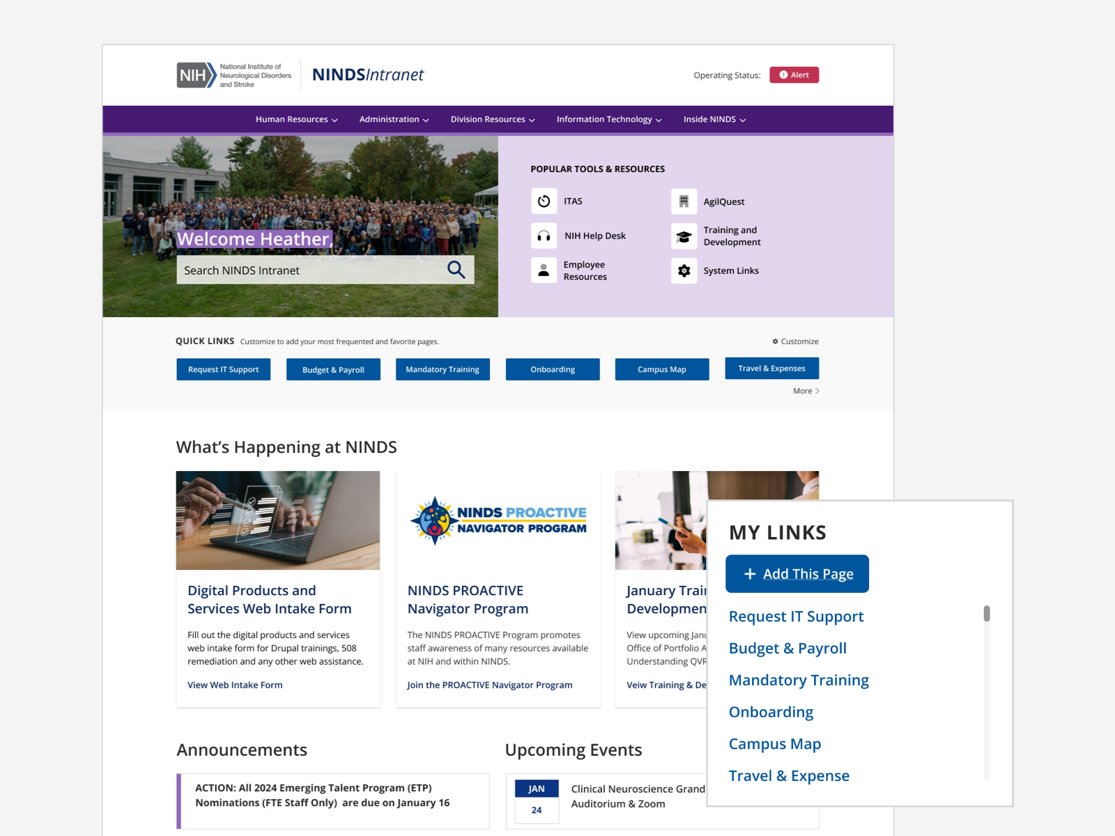The NINDS intranet redesign simplified the user experience through achieving minimalism and intuitive design. The redesign improved the design and functionality of the Popular Tools & Resources and customizable My Links feature. View NINDS Intranet Case Study ⟶